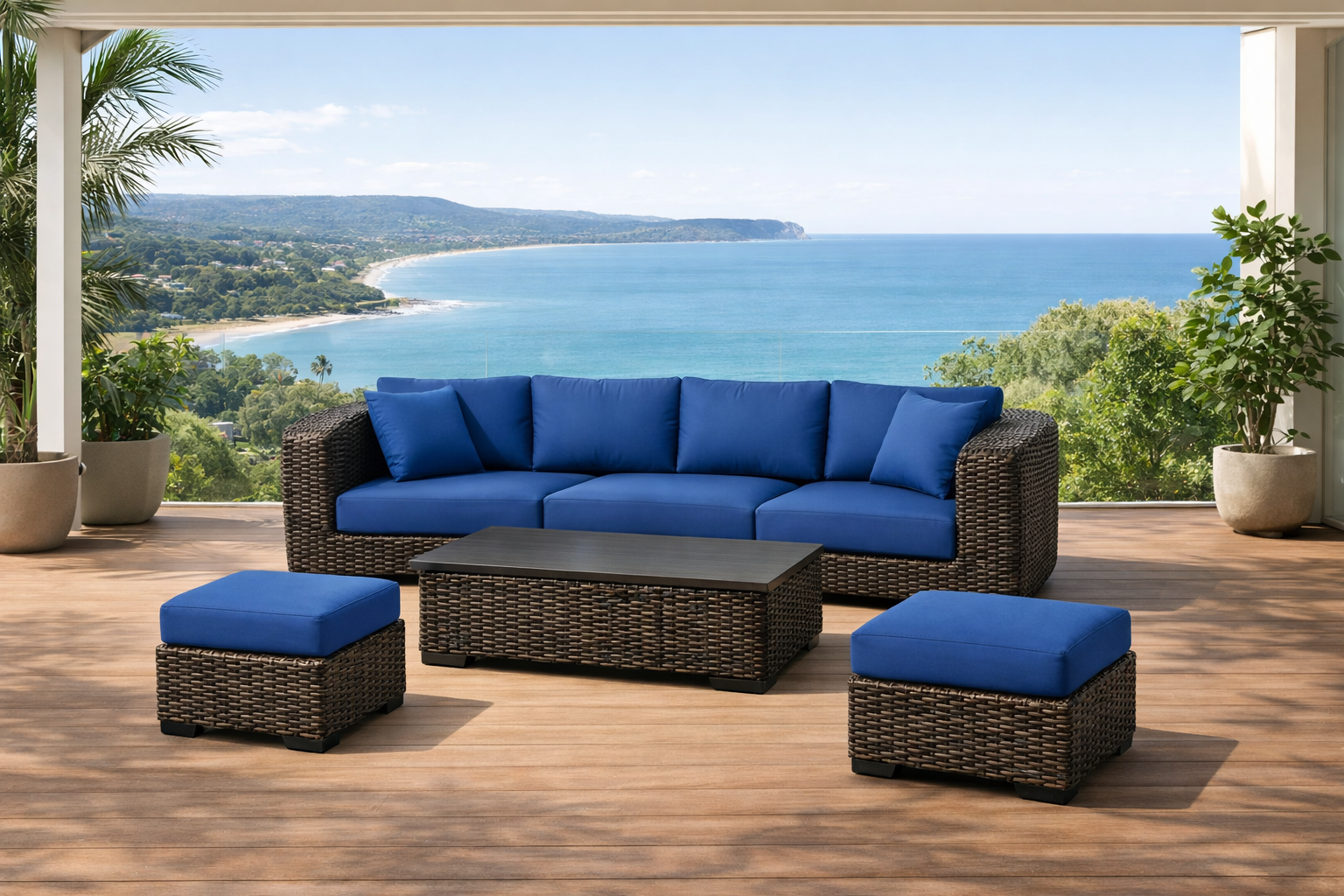 Weather-resistant wicker frame with removable blue cushions.